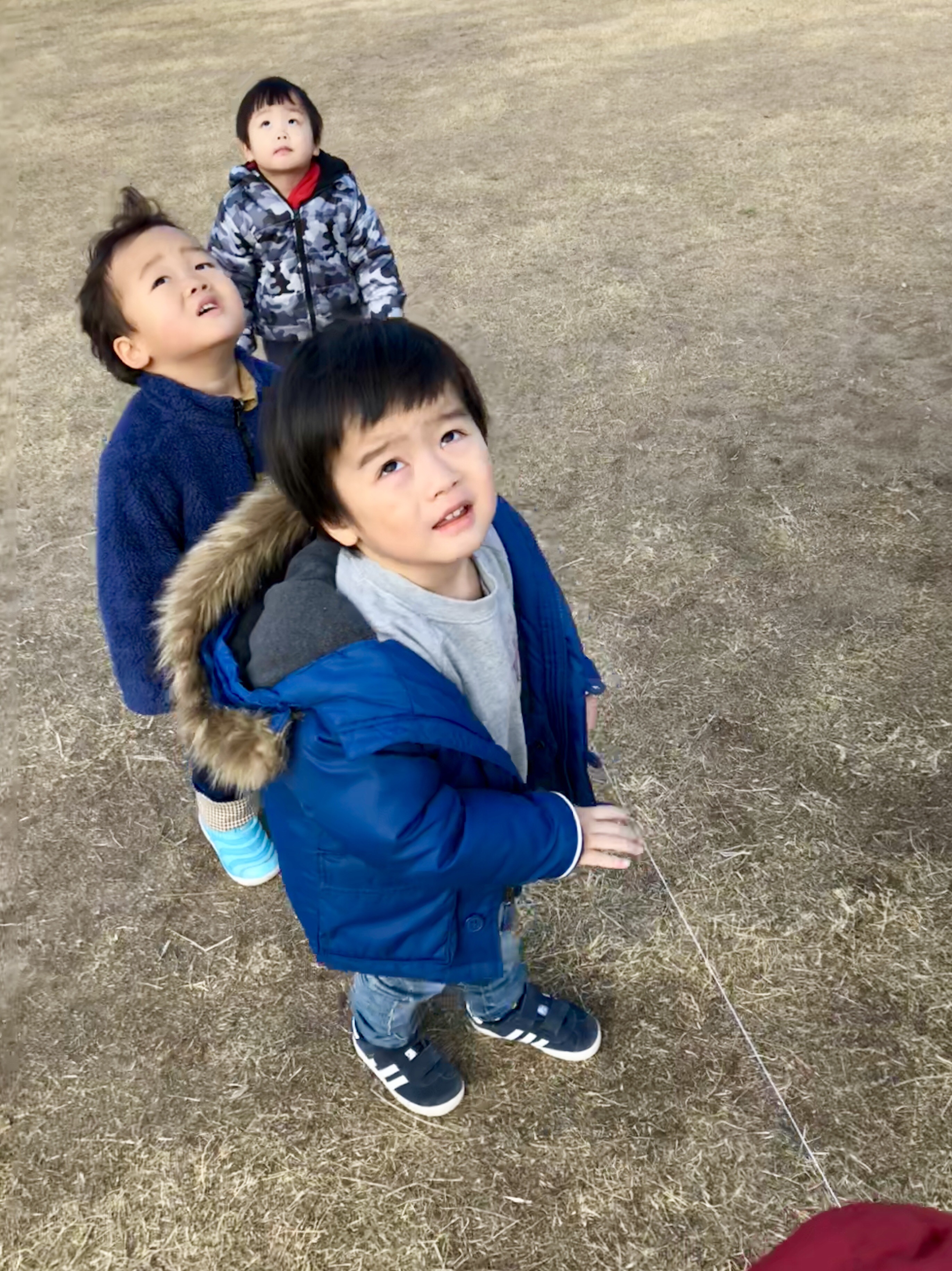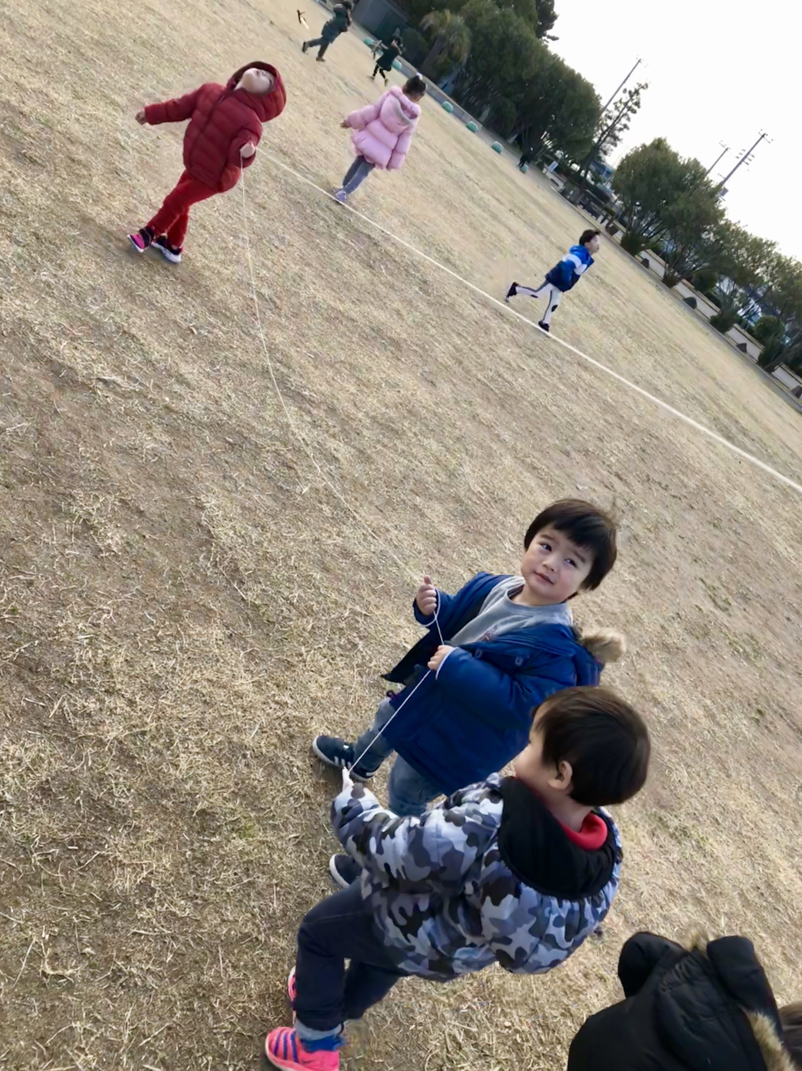 公園では、みんなで力を合わせて凧を空高く揚げ、楽しみました!!