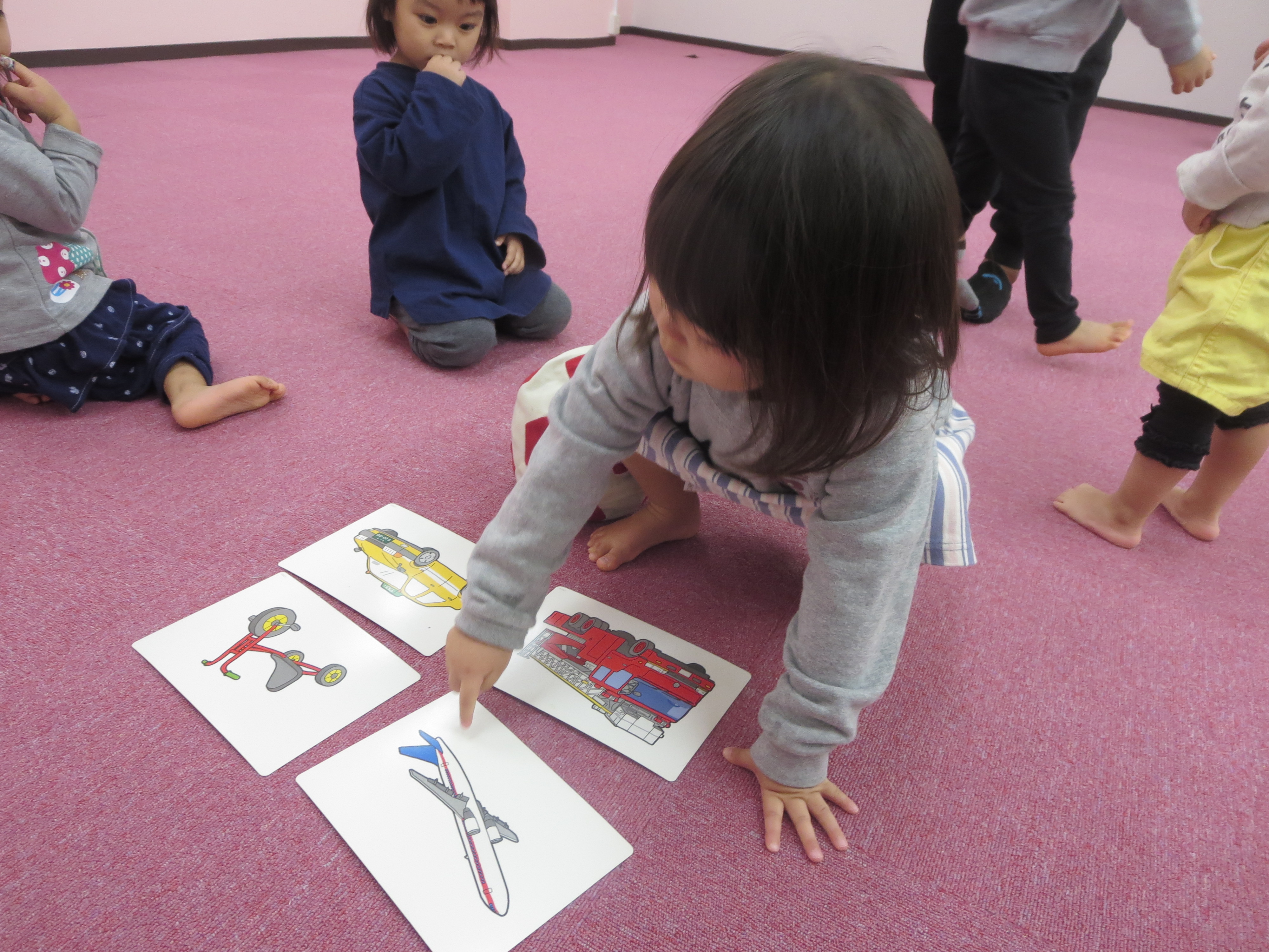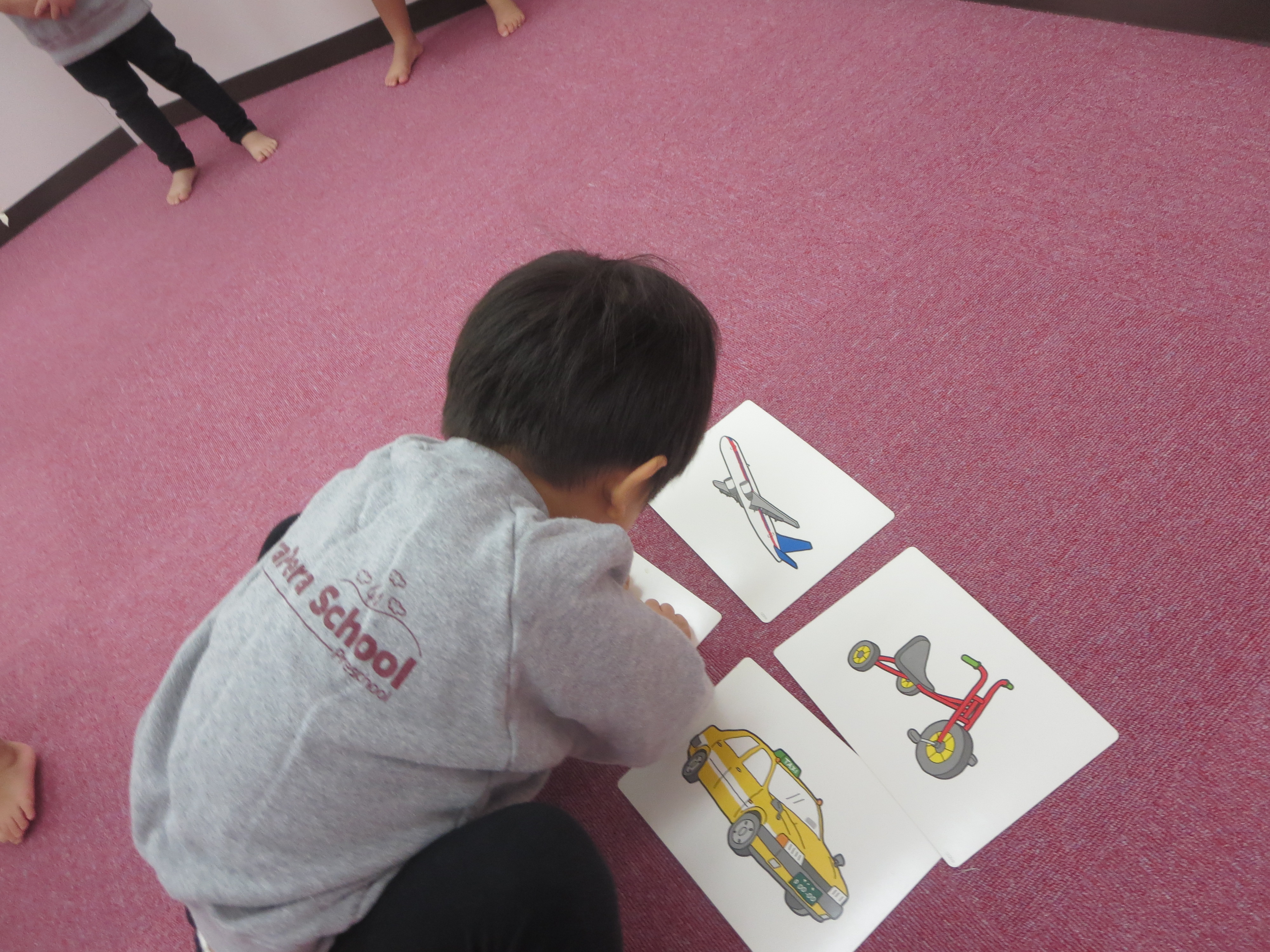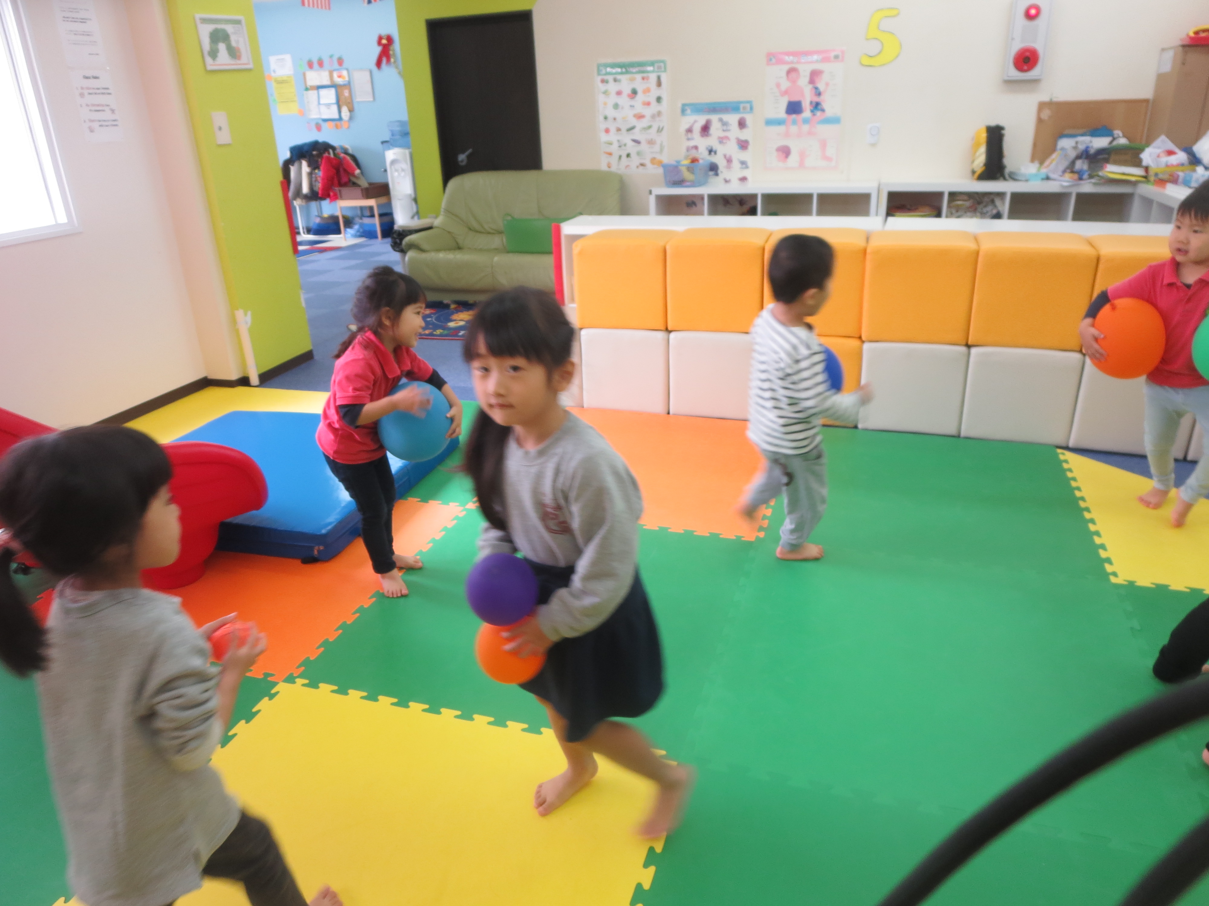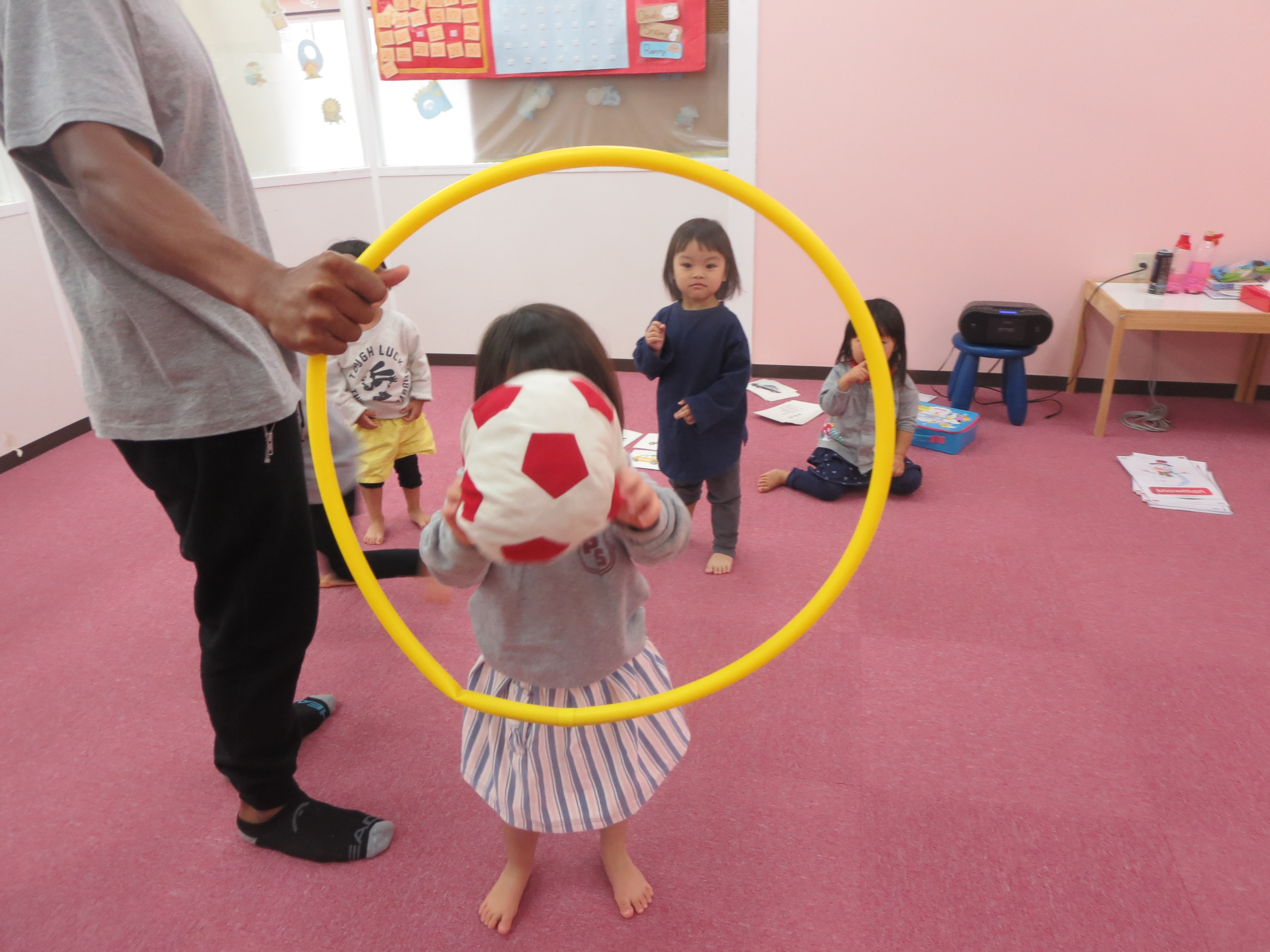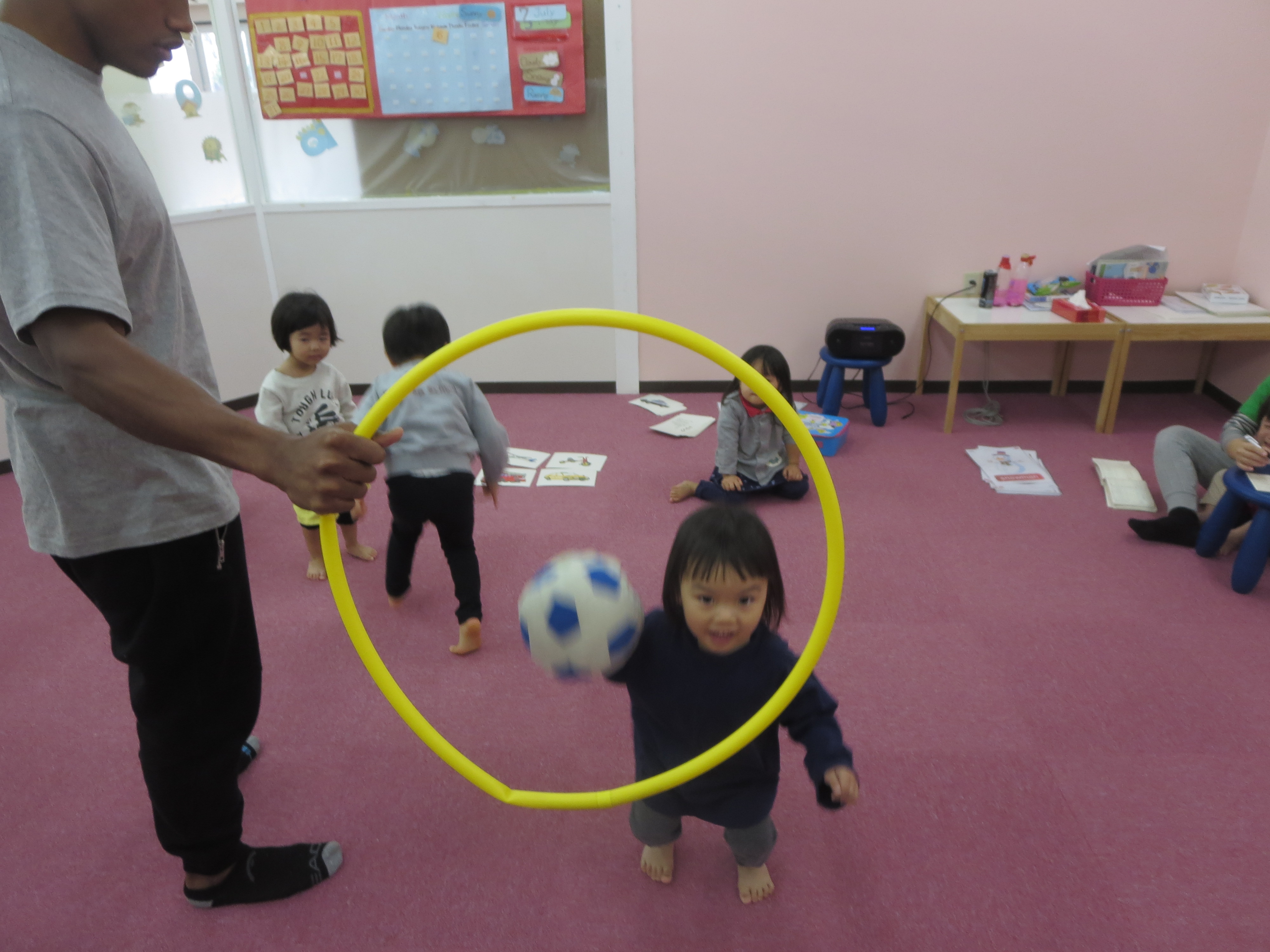 Cherry class は先生が言ったフラッシュカードをタッチしてボールをフラフープの中に投げていましたよ♪